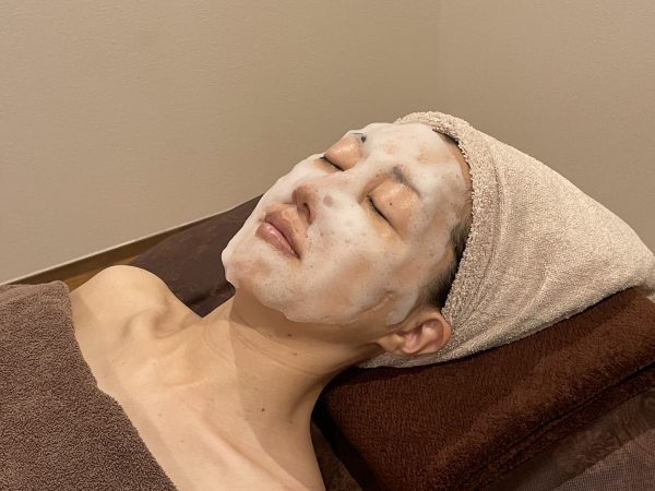 カウンセリング→フットバス→背面(脚・腰・お背中)→表面(お腹・腕)→クレンジング→炭酸泡洗顔→デコルテ~お顔リンパケア→保湿マスク→ヘッド)→お着換え→アフターティー